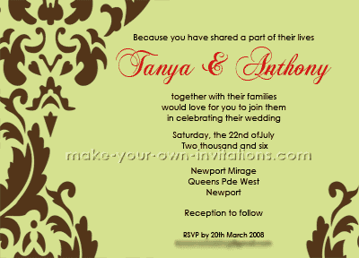 I made this invitation using Adobe Photoshop. The damask pattern you see was inspired by some old vintage wallpaper. It took me about a couple of hours to create the damask brush pattern but it was well worth the time in the end. If you have Photoshop you might prefer to hunt around on the internet for some free brushes using terms like 'damask brushes' or 'floral brushes'