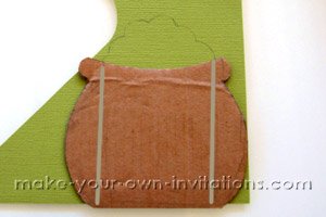 Step four Unfold the template and apple a thin line of glue along both sides of the top half of the cauldron card. Fold the card and firmly press along the sides to adhere the bottom half to the top half. This will create a pocket for the green bubble part of the invitation. |