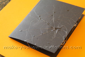 I had a lot of fun making these spider web invitations. We made the spider webs on the face of the card with a hot glue gun. The glue becomes very stretchy and gooey when it is heated which turned out to make the perfect spider web.